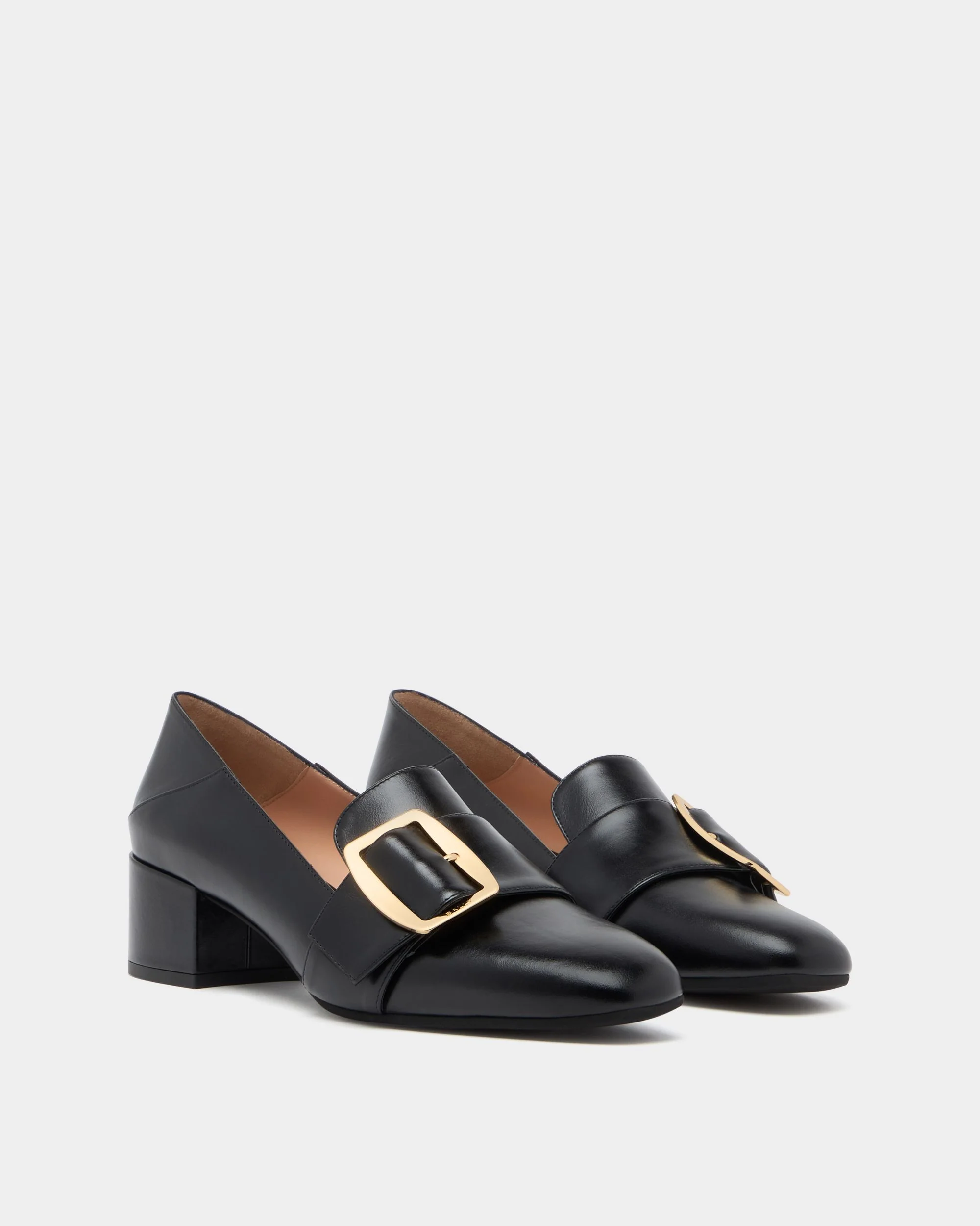 This Bally Boucle pump in black leather is characterized by the large buckle at the front, a reinterpretation of an iconic Bally detail from the 1920s. To the back, the heel folds down for use as a mule.