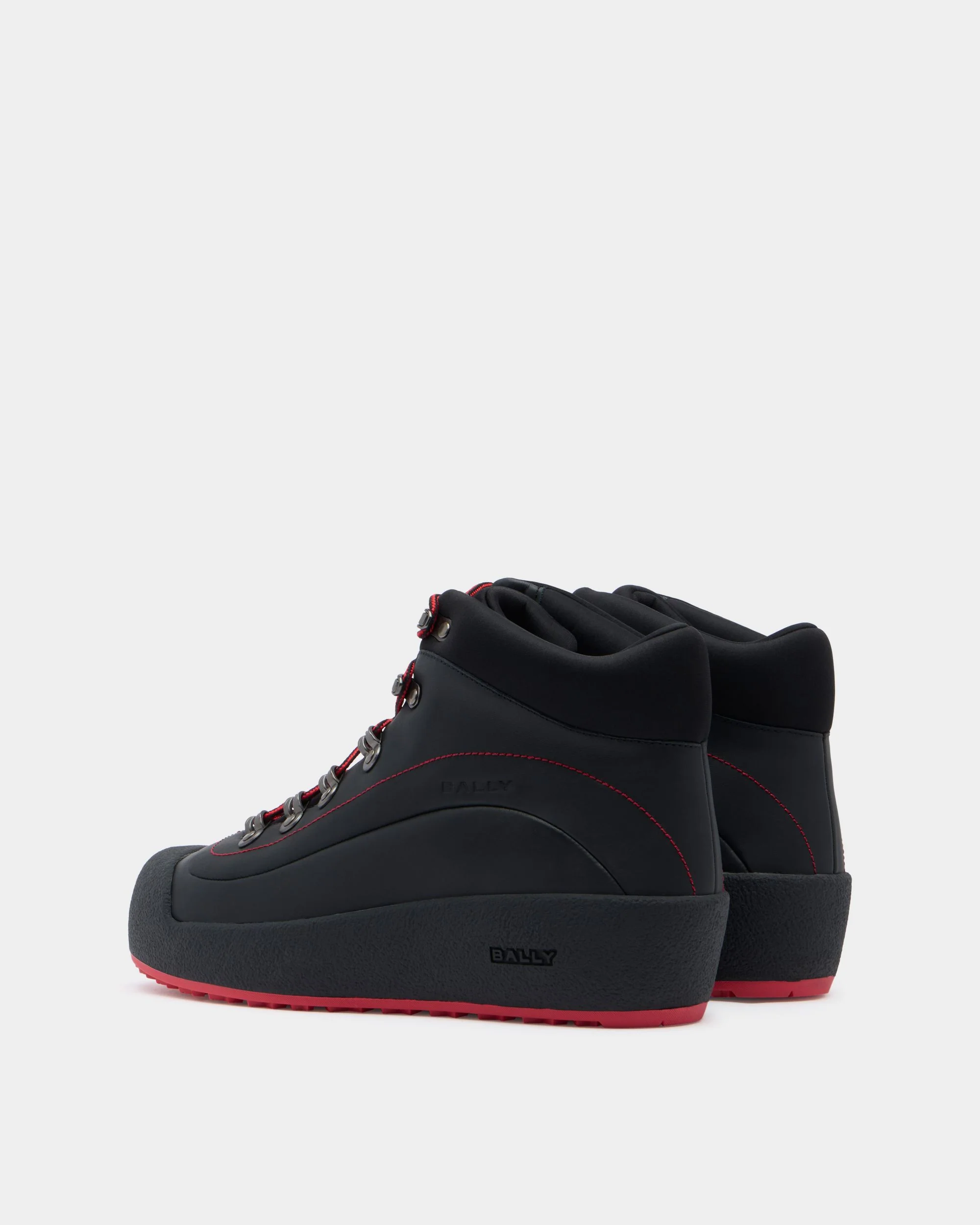 This lace-up Bally Curling bootie features a hiking-inspired design in black water-resistant leather with red topstitched details. The rubber sole is optimized for durability and performance, providing grip and insulation.