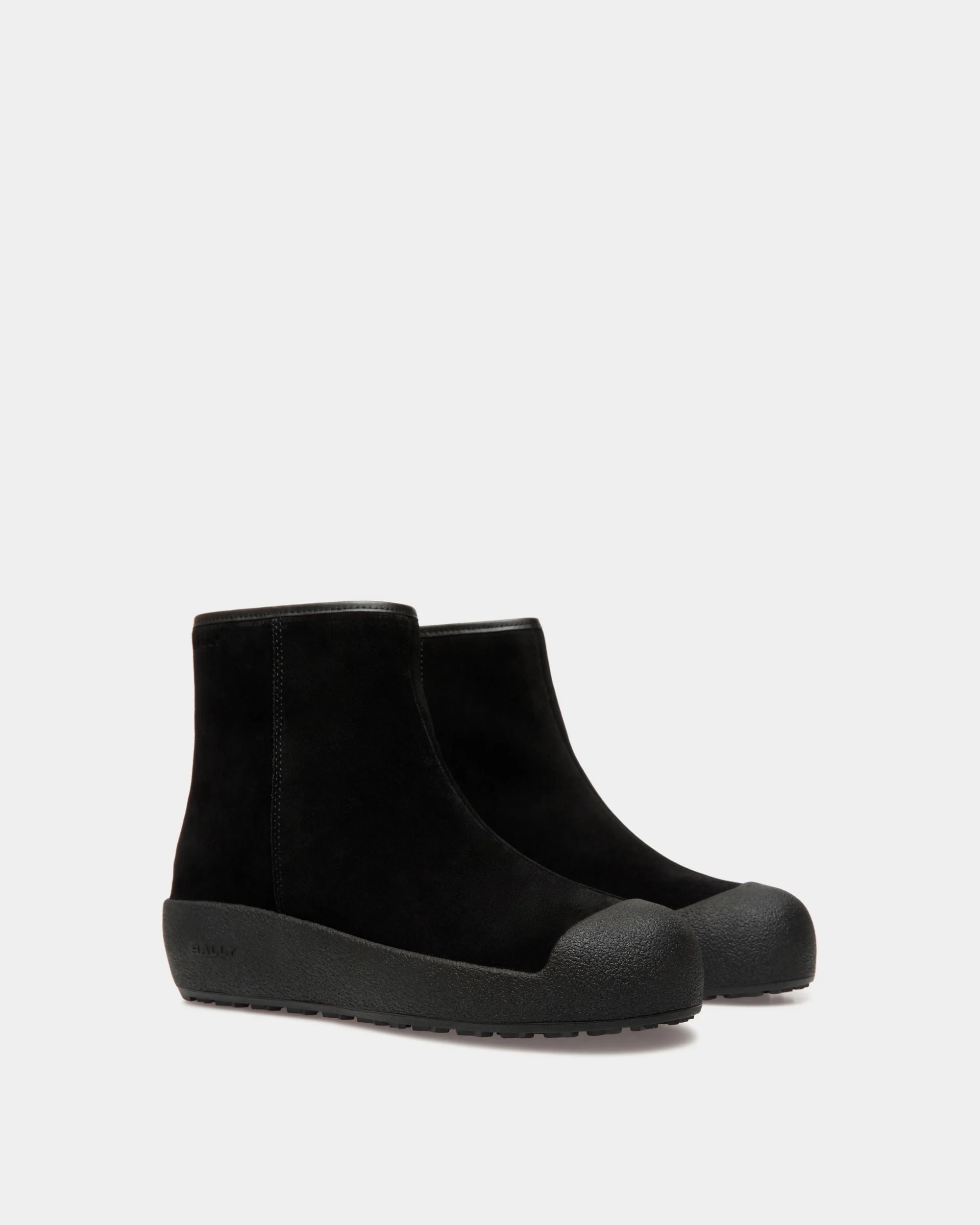 Inspired by a 1950s design by Bally for the Swiss Olympic team, this Curling bootie in black suede is engineered to insulate and cushion while providing maximum stability via the Vibram Arctic grip sole. A practical zipper fastens the back.