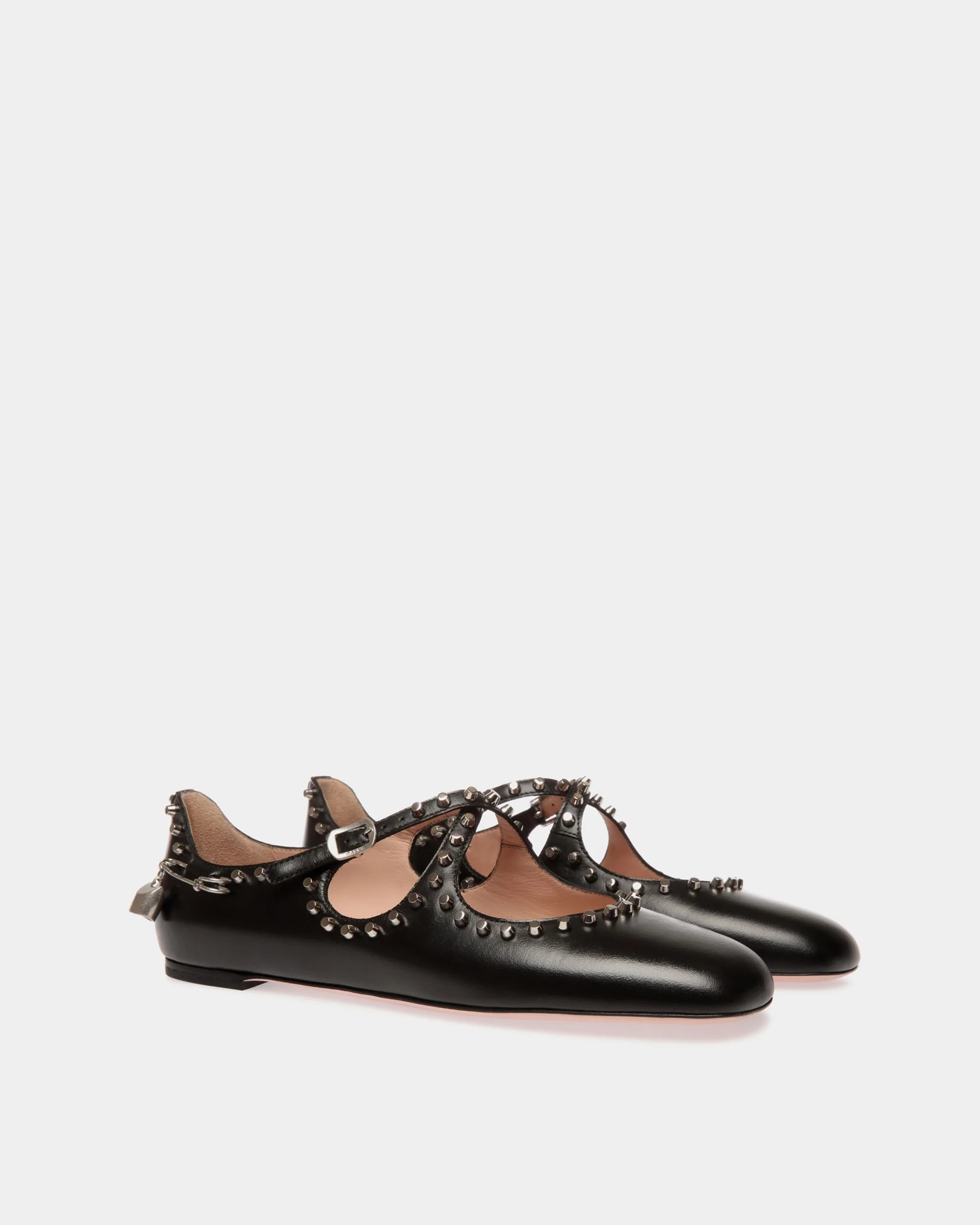 This Ballyrina flat is meticulously crafted in black calfskin and studded with metal details. Two slender straps cross at the top, secured by a metal buckle inspired by a design from the Bally archives.