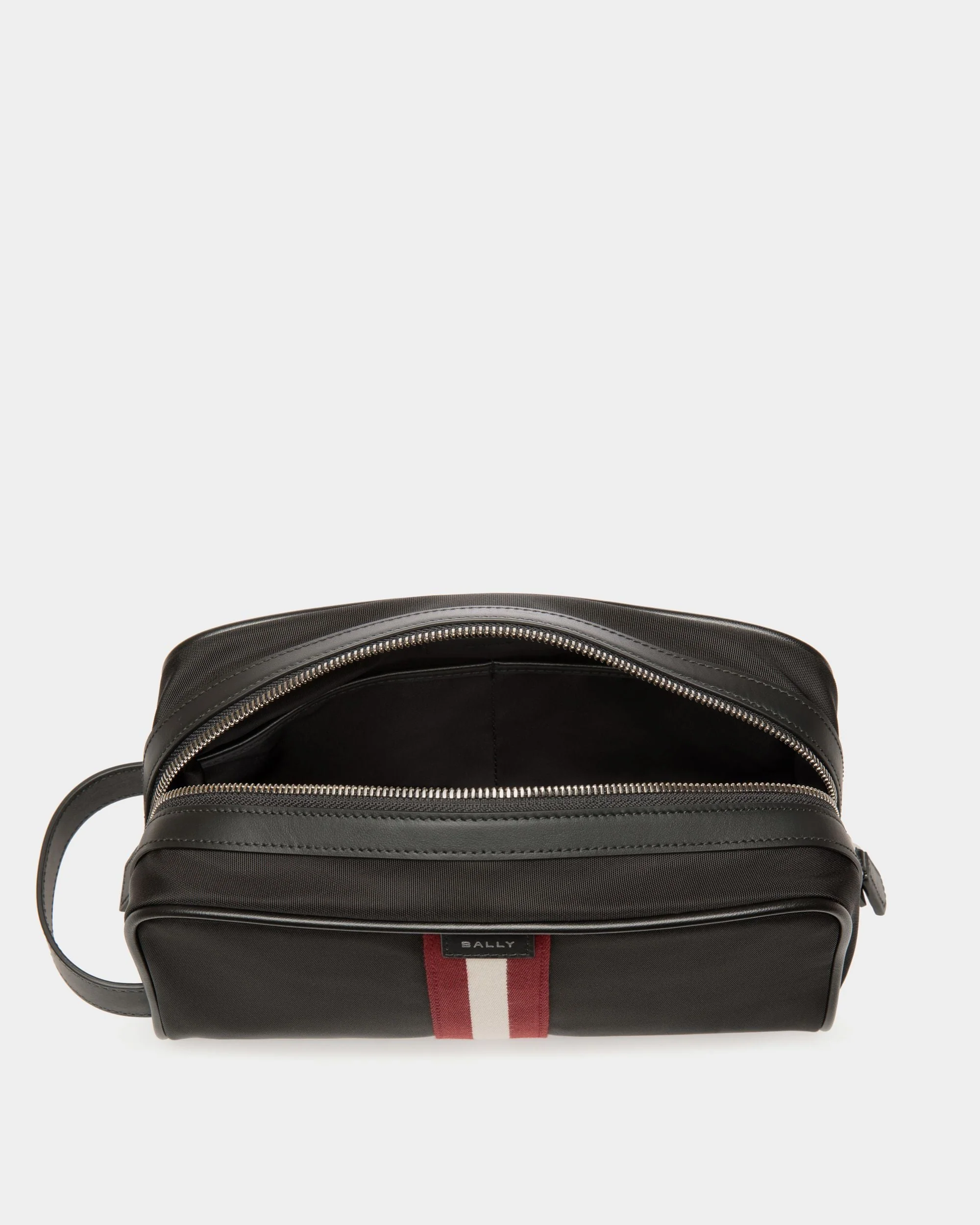 Code toiletry bag in durable black nylon trimmed by leather piping and a red and white Bally Ribbon. The main compartment opens via zipper to reveal practical pockets on the inside.