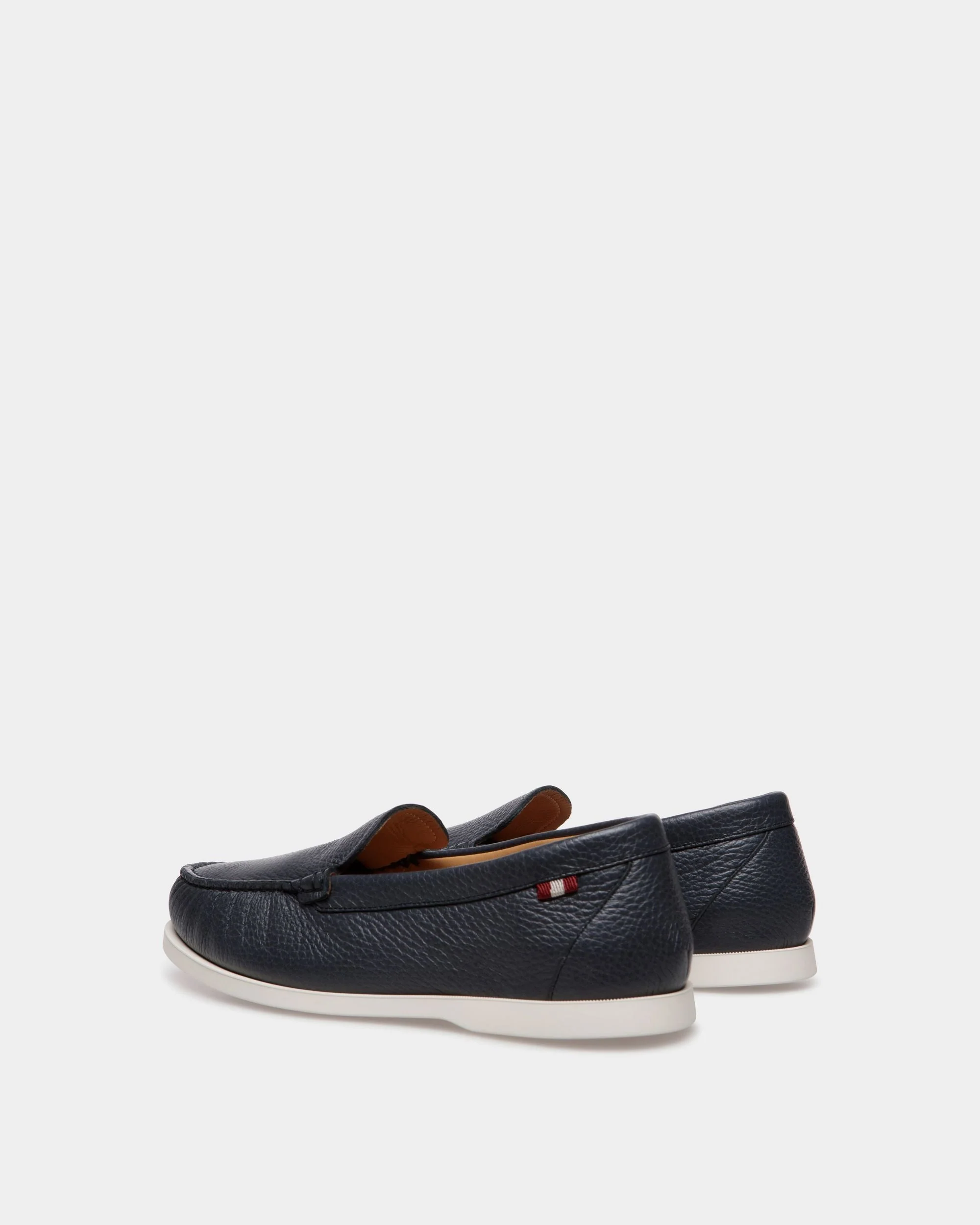 This Nelson loafer in navy blue deer leather is finished with a full grain texture. True moccasin construction and a lightweight rubber sole ensure step-in comfort.