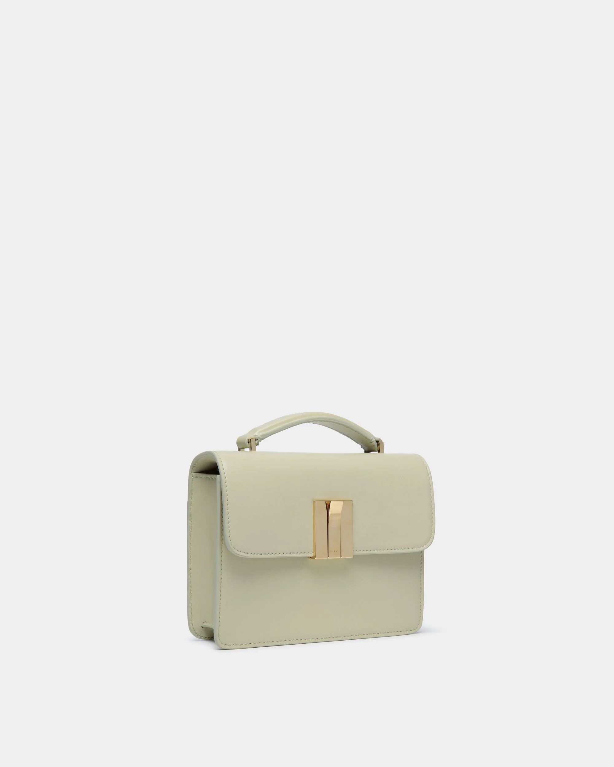 A geometric silhouette is the hallmark of the Ollam mini top handle bag in Antique White brushed calfskin. The gold toned hardware closure in the shape of the Bally Ribbon is a simple yet elegant interpretation of the brand's heritage.