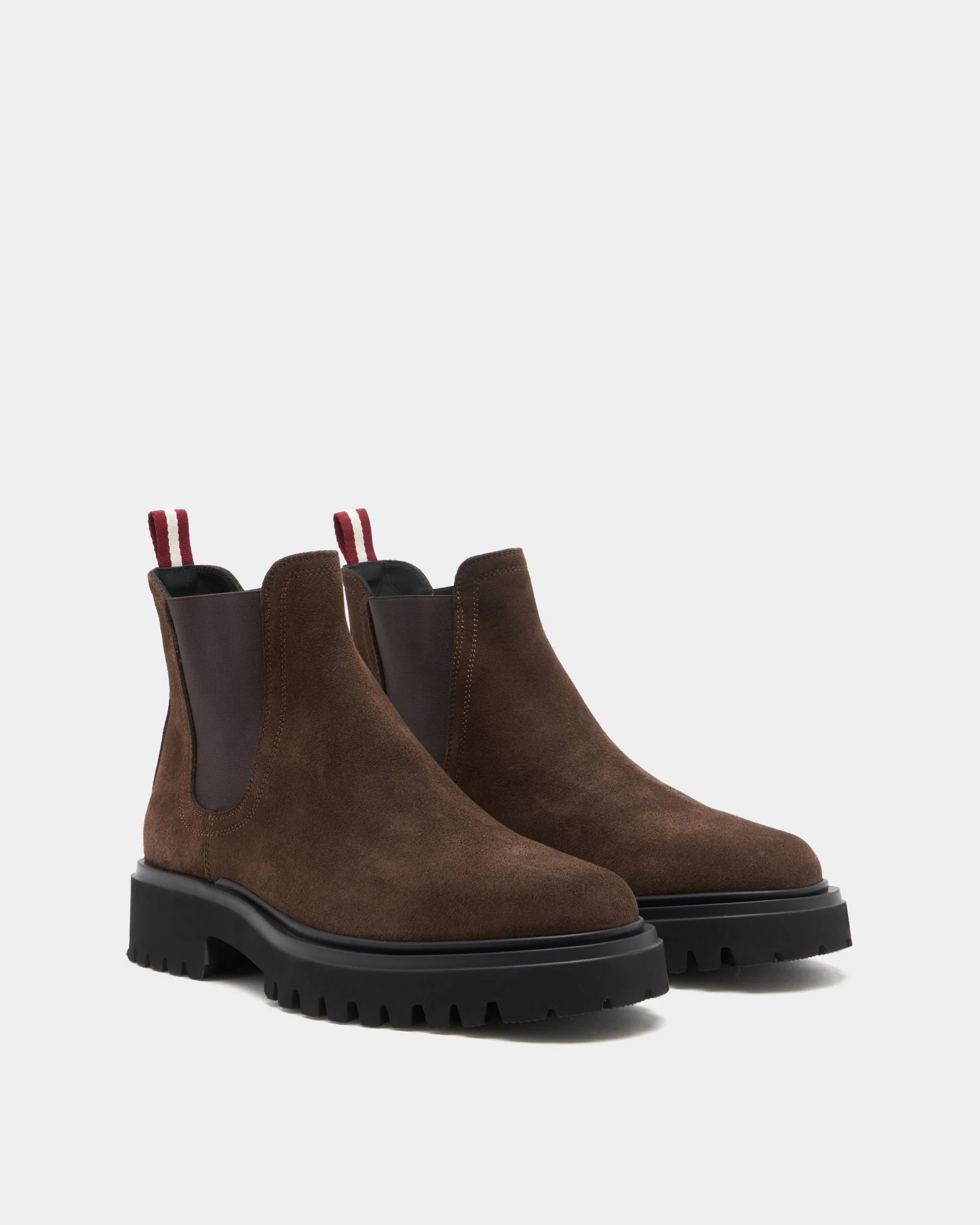 This Onyce bootie has a brown suede upper with elastic panels at the ankles and a Bally Ribbon pull tab at the back. A chunky rubber sole adds a contemporary touch to this Chelsea-style boot.