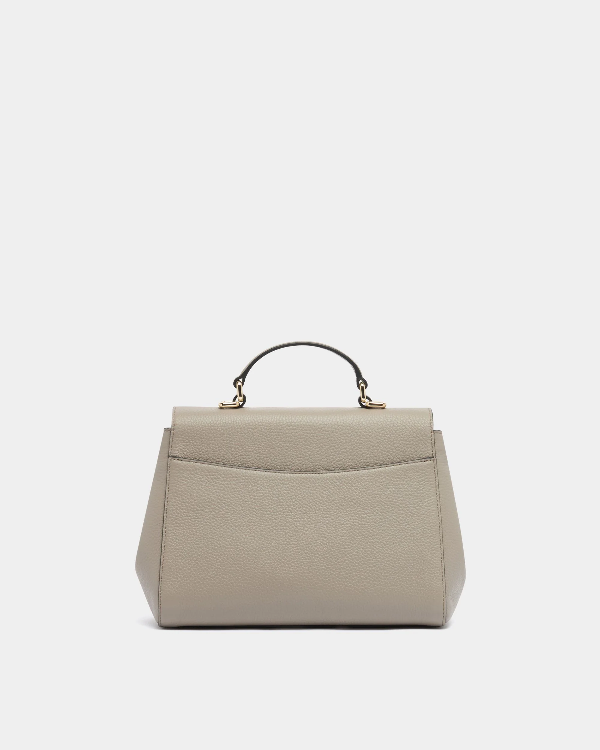This geometric top handle bag is constructed in taupe grained calfskin with lateral snaps to adjust its shape and capacity. A Bally B-Chain detail in metal decorates the front flap.